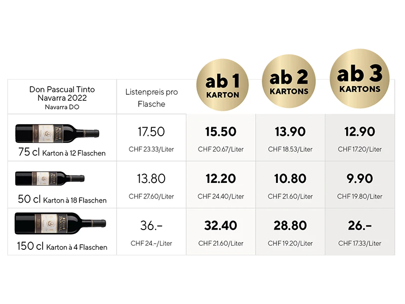 Zusätzlich ab 3 bestellten Kartons erhalten Sie eine Magnumflasche (150 cl) des Don Pascual Tinto Navarra 2022 im Wert von CHF 36.- geschenkt.
