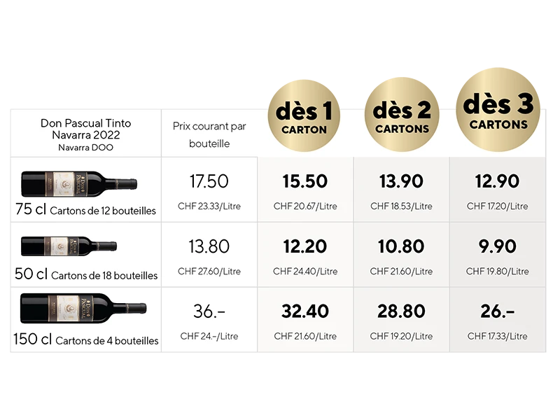 En plus, dès 3 cartons commandés, vous recevez en cadeau une bouteille magnum (150 cl) de Don Pascual Tinto Navarra 2022, d’une valeur de CHF 36.–.