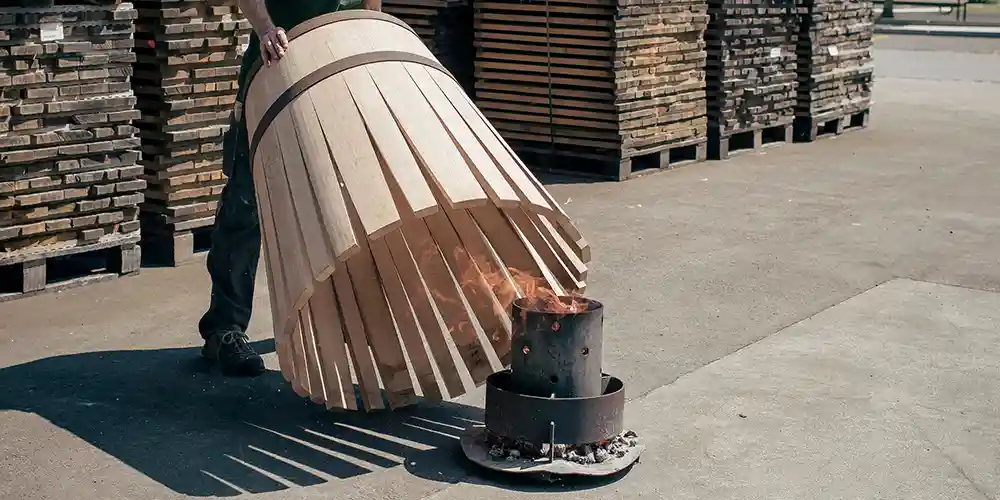 En utilisant une chaleur et une humidité précisément adaptées, les douelles sont pliées. Le grillage ou «toastage»de l'intérieur de la barrique se fait sur des copeaux de chêne et confère au vin des notes gustatives supplémentaires raffinées. En étroite collaboration avec le maître de chai, notre tonnelier détermine le degré de toastage souhaité, en fonction du caractère du vin auquel la barrique est destinée. Cette délicate adaptation de la note de torréfaction au vin est l'un des secrets de la qualité de SCHULER.