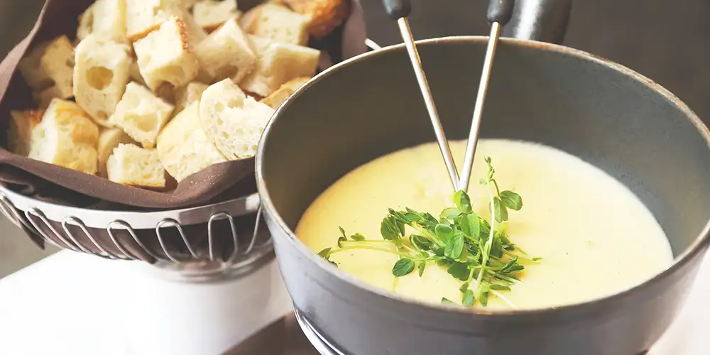 ...et aussi le classique numéro 1 – le pain! Il est tout simplement idéal pour accompagner une délicieuse fondue, de préférence du pain blanc ou mi-blanc avec beaucoup de bords croustillants, de sorte qu'il reste le plus longtemps possible sur la fourchette. C'est pourquoi le pain peut être vieux d'un jour sans problème, car le pain frais sorti du four est moins adapté à une fondue parfaite. N'hésitez pas à couper le pain en morceaux quelques heures avant, afin de conserver l'effet croustillant. Si vous aimez faire des expériences et que vous ne voulez pas toujours être accompagné de pain blanc, n'hésitez pas à essayer le pain aux noix, le pain de maïs ou le pain de campagne.
