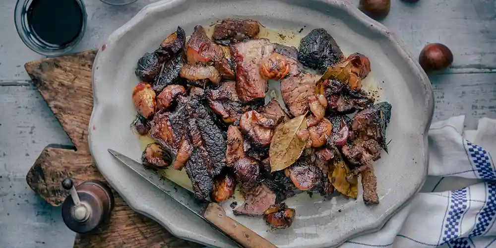- Éplucher les échalotes et les couper en huit. Les mettre dans la poêle dans laquelle la viande a été saisie et les faire revenir avec les marrons pendant 7 à 8 minutes environ en les colorant. Ajouter le concentré de tomates, faire revenir brièvement, ajouter les feuilles de laurier et déglacer avec le vin rouge. Faire réduire légèrement ce dernier et assaisonner avec du piment.