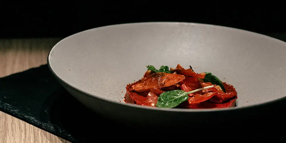 - Dresser les assiettes: A l'aide d'un plat de présentation, donner au coulis de tomates une forme ronde, y disposer les dés de tomates et les tomates séchées ainsi que les chips de tomates. Saupoudrer d'un peu de piment d'Espelette, de paprika fumé en poudre et de sel. Ajouter enfin des feuilles de jeunes épinards assaisonnées.