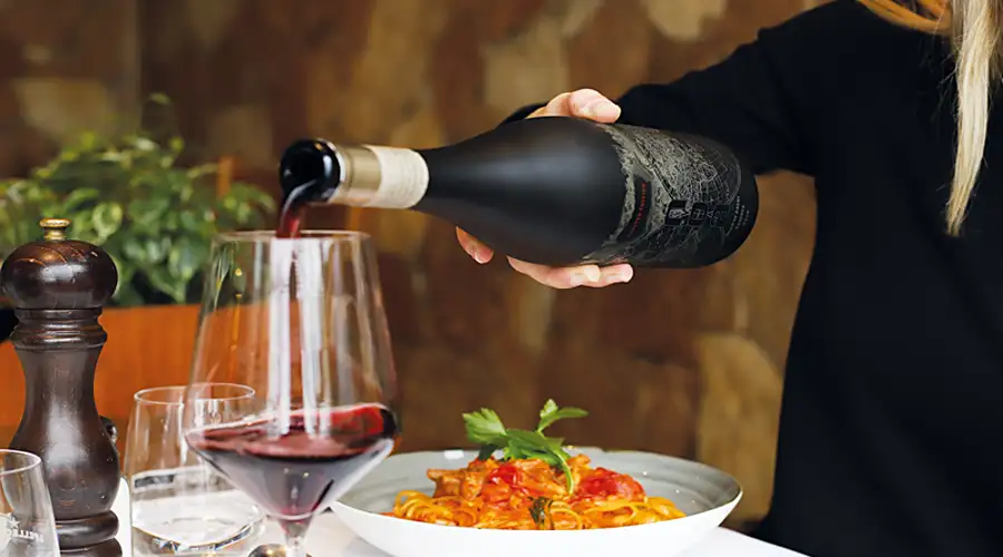 On verse correctement par la droite. Saisissez le verre par le pied, tenez-le en biais et laissez le vin rouge s'écouler dans le verre de très près. La contenance doit être d'environ un décilitre.