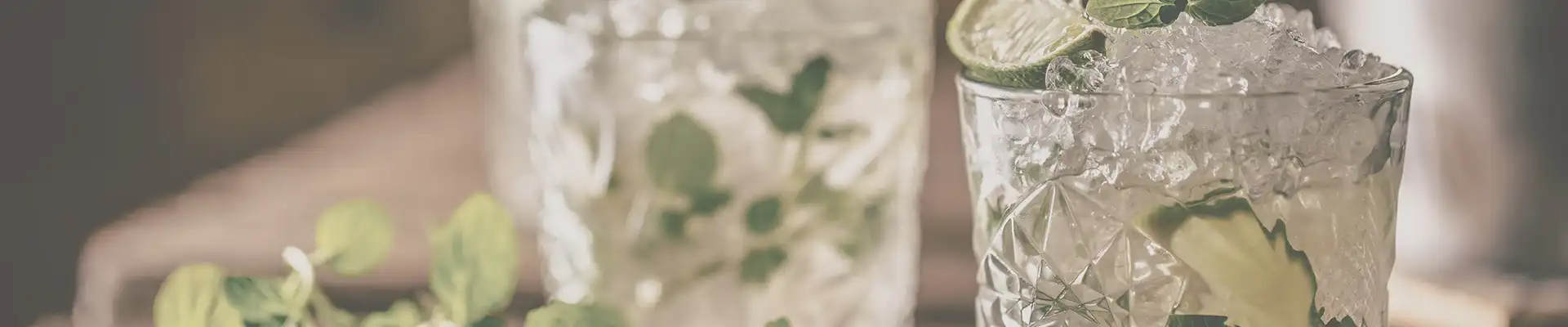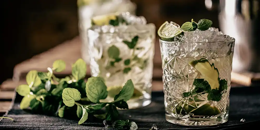 - Die Limette mit der Minze und dem Zucker mit einem Stössel in einem Tumbler zerdrücken.