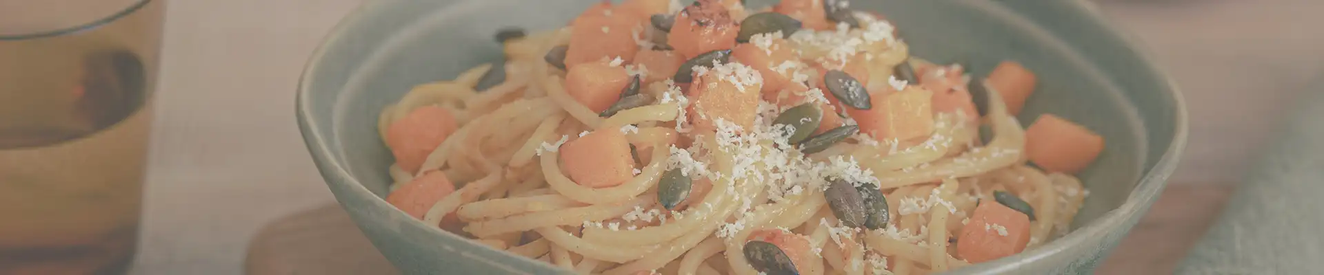 - Spaghetti auf den Teller portionieren, Kürbissauce darüber geben und mit Kürbiskernen und den restlichen Peterli garnieren.