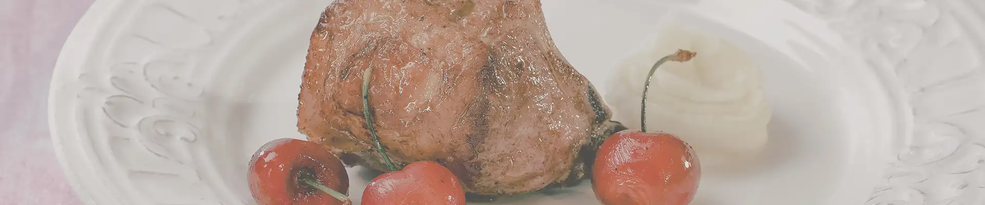- Das Fleisch von allen Seiten im heissen Olivenöl 3-4 Minuten in einer tiefen Pfanne anbraten, dann herausnehmen, die Kirschen in die Pfanne geben, kurz angehen lassen, wieder herausnehmen und beiseitestellen. Suppengemüse in der Pfanne anbraten, Rosmarin Knoblauch, Tomatenmark dazu geben und alles anrösten. Mit Verjus ablöschen, den Saft ergänzen und kurz einköcheln lassen. Den Fond angiessen und einmal aufkochen. Mit Salz und Pfeffer würzen.