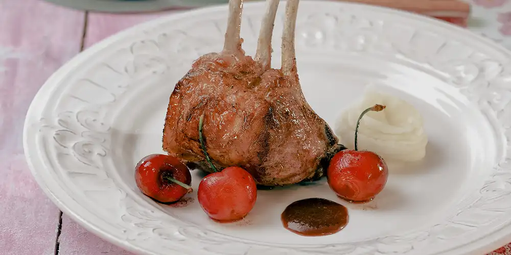 - Das Lamm in eine Ofenform geben, die Sauce dazu giessen und im vorgeheizten Ofen bei 180°C ca. 35 Minuten garen. Herausnehmen und das Fleisch in Alufolie gewickelt ruhen lassen. Die Sauce durch ein feines Sieb in einen Topf passieren und 5 Minuten einkochen. Das Püree wieder erhitzen und seitlich am Teller anrichten. Das Fleisch in 4 Stücke teilen und mittig mit den Knochen nach oben auf dem Teller platzieren. Kirschen dazu legen, etwas Sauce angiessen und servieren.