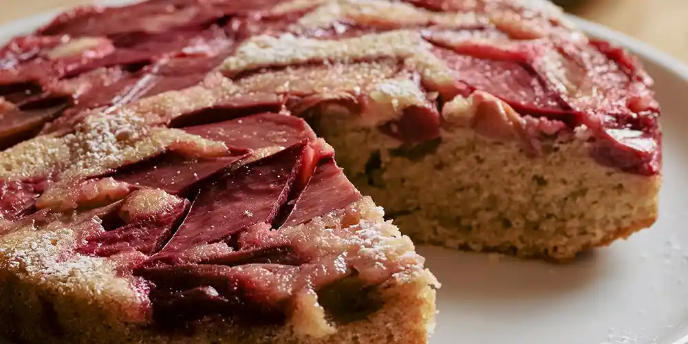 - Das Mehl mit den Kokosraspeln sowie dem Backpulver vermischen und abwechselnd mit der Kokosmilch unter die Schaummasse ziehen, bis ein geschmeidiger, schwer-reissender Teig entstanden ist. In die Form geben und glattstreichen. Den Rhabarber auf den Teig verteilen und leicht eindrücken.