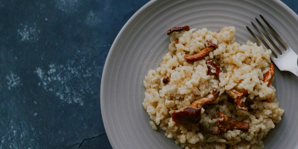 - Die getrockneten Pilze mit 2 Kellen Gemüsebrühe hinzufügen. Die Pfanne schütteln, ohne den Reis zu berühren. Weiter nach und nach Brühe hinzufügen, bis der Reis al dente ist.